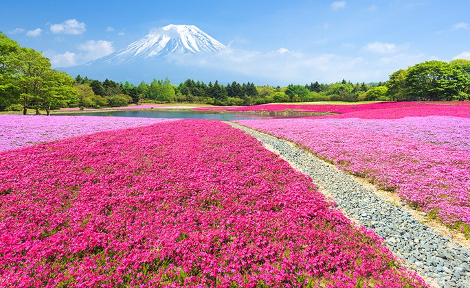 富士芝櫻祭~關東最大規模:富士五湖中,本栖湖畔的芝櫻公園從4月下旬開始的一整個月,為首都圈最大規模,約80萬株芝櫻與富士山的共同演出,色彩鮮豔的明亮對比美不勝收,熱情綻放的芝櫻會完全打破日本櫻花嬌嫩柔媚的印象,教人神往。<br><br>大石公園【河口湖岸拍攝富士山絕景】:大石公園位於河口湖北岸,從公園能一覽富士山和河口湖的美麗景色。全長350m鋪著鮮花的步行街,從4月上旬開始到5月下旬芝櫻像粉紅色顏色的地毯一樣地展開,6月從下旬開始到7月下旬盛開清爽的紫色薰衣草,10月從中旬開始下旬掃帚草通紅,冬日天晴萬里無雲時,還有機會看到難得一件的「鏡富士」。花叢和富士山,河口湖的對比堪稱絕景。 園內有「河口湖自然地生活館」,能制作果醬、櫻桃和藍莓自助的水果採摘。還有供應特制藍莓冰淇淋的咖啡。<br>・4月下旬~5月下旬