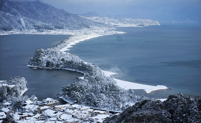 天橋立位於京都府宮津市,是日本三景之一(與廣島的宮島、宮城的松島並列)。這是一條長約3.6公里的沙洲,上面生長著約5000棵松樹,橫跨宮津灣,宛如一道天然的橋樑,因此得名「天橋立」(意為「天上的橋」)。
