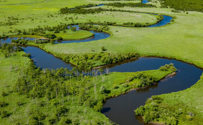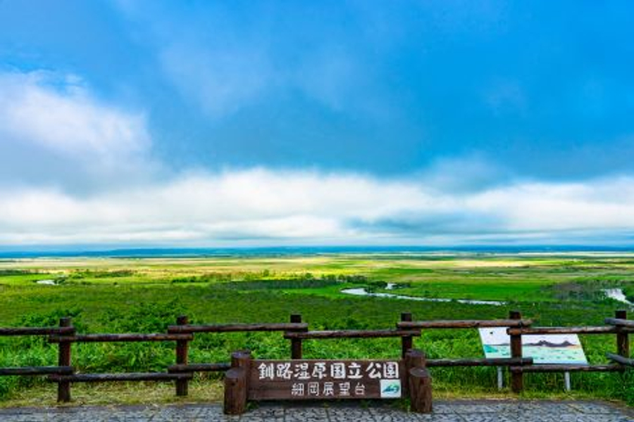 釧路濕原位於北海道東部的釧路市北面,是日本第一個在拉姆薩爾條約(有關水禽生息地的國際條約)上登記的濕地。總面積 183 平方公里,十分遼闊。這裏生息著北海道鹿(蝦夷鹿),白尾雕等2000 種動植物。一到夏天,百花爭奇鬥豔,而寒冬時節還會有特別天然紀念物丹頂鶴的光臨。而周圍的丘陵上建造了幾座瞭望台,方便遊客登上觀覽天地廣闊的大自然美景。漫步在瞭望臺旁的散步路上,近可俯看蜿蜓的釧路川,遠可眺望阿寒的群峰。