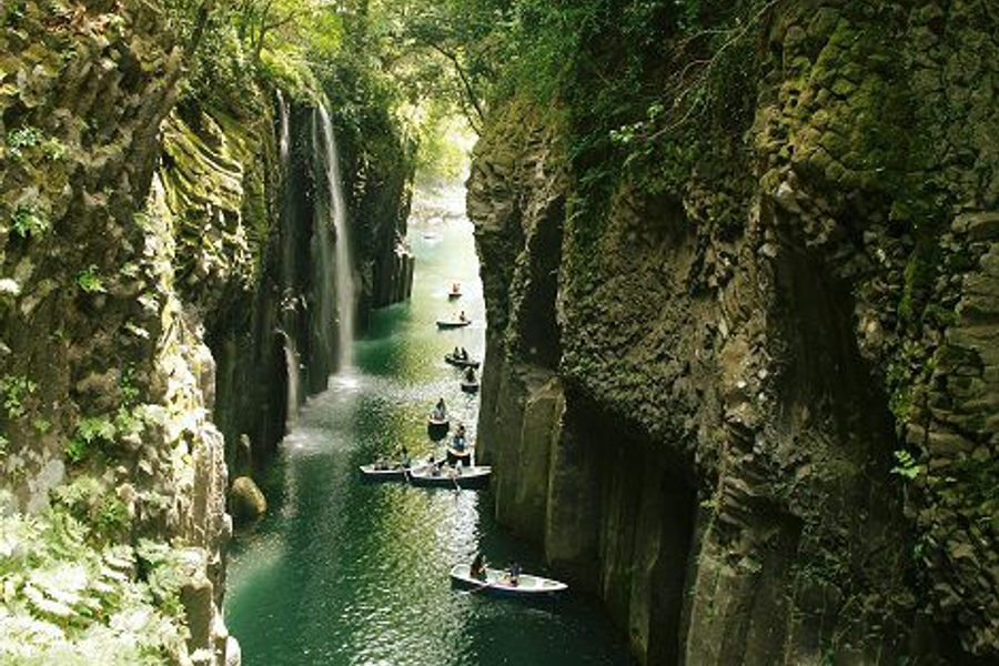 九重夢大吊橋【日本第一大吊橋】:●斥資億日元建造完成,並於2006年10月30日開放通車的日本第一大吊橋【九重“夢”吊橋】(又稱天空步道),標高777公尺,高於鳴子溪谷的河面上173公尺,全長390公尺的行人道專用,也是日本最大、最高、最長的吊橋。<br>由於山區天氣不穩定、風勢較大,怕旅客撐傘危險,依規定,如遇雨天一律著雨衣,不便之處敬請見諒。<br>高千穗峽【雄偉壯闊的自然美景】:◎過去阿蘇火山噴發出的火山碎屑流沿著五瀨川流動,急速冷卻後形成柱狀節理,造就了高千穗峽溪谷壯麗的懸崖景色。尤其以真名井瀑布的17公尺落差最為雄偉、震撼。<br><br>真名井瀑布【日本瀑布百選之一】:真名井瀑布是日本宮崎縣高千穗峽的象徵,從約17公尺高的岩壁傾瀉而下,水流直接入清澈的五瀨川中,搭配兩旁壯觀的柱狀玄武岩,形成如畫絕景。它不僅是日本瀑布百選之一,更因與日本神話淵源深厚而增添神秘色彩。遊客可划船近距離感受其磅,或沿步道俯瞰全景。<br><br>高千穗神社:擁有約1800年歷史的古老神社,是高千穗鄉八十八社的總社,神社本殿與收藏的一對鐵製狛犬皆被指定為國家重要文化財。主祭神是高千穗皇神與十社大明神,在農業、除厄、姻緣方面尤其靈驗而深受信仰。高千穗皇神為日向三代與配偶神之總稱,十社大明神則供奉三毛入野命等十柱神祇。<br><br>