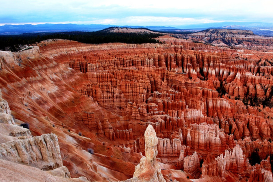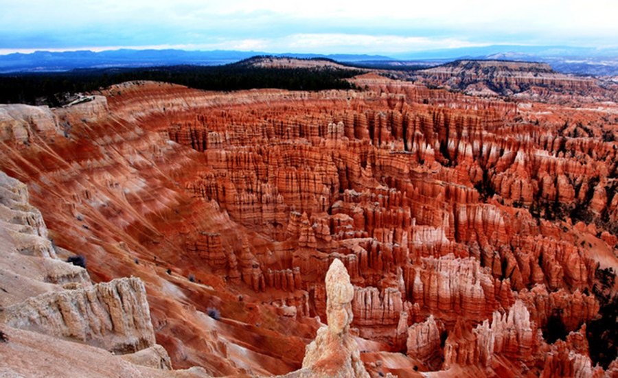 7.布萊斯國家公園~千變萬化的亮麗虹彩,躍動的峽谷。走在布萊斯國家公園內,放眼盡是酒紅、橙橘、茶褐色的洞穴奇石,隨陽光照射的角度不同,千變萬幻的色彩讓人嘆為觀止!上萬個歷經百萬年的風霜雨雪侵蝕而成的石柱群-有的如寶劍直入雲宵、或是如少女婷婷玉立……,令人不禁讚歎天地造物的神奇。位在布萊斯峽谷的日出點、日落點、及布萊斯點等,都是駐足遊賞的絕佳地點;想像群集而立的奇岩山石,就好像是一排排靜靜聆聽歌劇的觀眾,當夕陽西下時,襯著鮮明的紅色岩石,剎那間,原本屏氣凝神的觀眾們,彷彿就要起立鼓掌了呢!