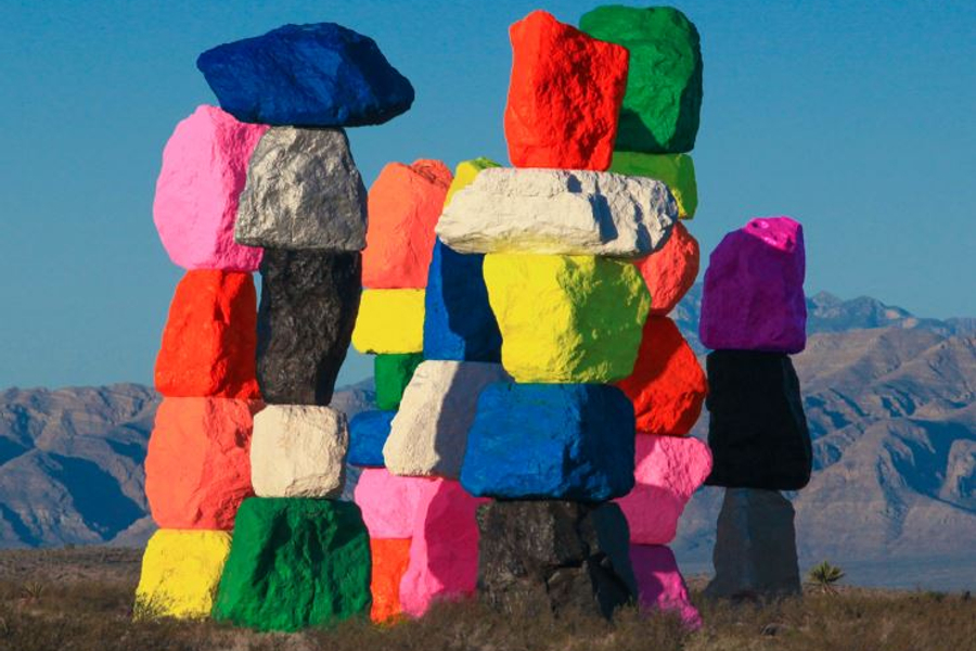 沙漠中的驚奇~七彩巨石陣是一位瑞士藝術家所創作的大型戶外裝置藝術,由33顆巨石所組成,每座石頭柱高達7~9公尺,人類站在一旁顯得超迷你!因為重量、體積都相當大,整個裝置藝術耗時五年才完成!鮮豔的色彩及特殊的排列造型,宛如巨大樂高積木,成為沙漠裡一大亮點。。【優勝美地國家公園YOSEMITE N.P.】