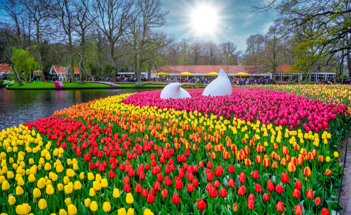 世界最大且每年只開放二個月的庫肯霍夫鬱金香花園。每年春天,庫肯霍夫公園就變成了一場視覺的饗宴。上百萬的鬱金香和其他球莖花卉爭奇鬥豔,錯落有致的花色迎面而來,鬱金香與其他球莖花卉佈滿80公畝大的土地,展現傳統和現代的景觀園藝。