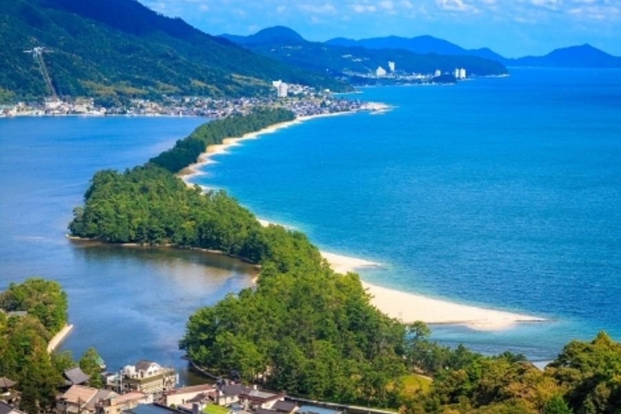 天橋立位於京都府宮津市,是日本三景之一(與廣島的宮島、宮城的松島並列)。這是一條長約3.6公里的沙洲,上面生長著約5000棵松樹,橫跨宮津灣,宛如一道天然的橋樑,因此得名「天橋立」(意為「天上的橋」)。