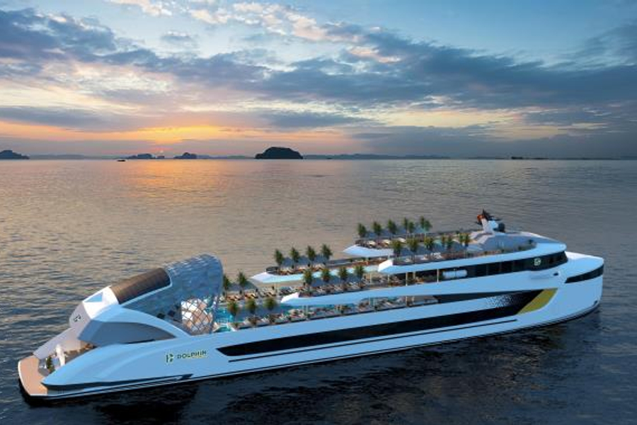 乘著2025年8月首航,夢幻的海豚號遊輪(Dolphin Halong Cruise),展開一場結合自然美景與現代奢華的下龍灣日間航程。這艘全新打造、總噸位達1500噸的精品級遊輪,全長約100公尺、寬20公尺,可容納超過600位貴賓,是下龍灣首艘以「娛樂與感官體驗」為核心設計的豪華遊輪。