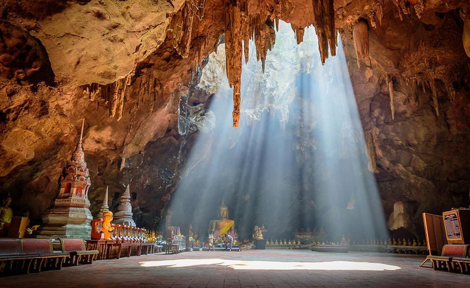 一處位於 92 公尺高的拷龍山上,是碧差汶里府最重要的一個石窟。參觀拷龍穴(Tham Khao Luang)」,要先有心理準備,身上不可帶有任何的食物,也不可以帶任何的塑膠袋。因為拷龍穴外住有一大群的野生猴子,而這些頑皮的猴子們,知道來訪的遊客身上通常都會帶有食物,特別是裝在塑膠袋裡,因此常常發生猴子搶人的物品慘事!裡頭則有個如鐘乳石洞的超大洞穴。而洞壁上大小奇岩怪石的造型,加上洞頂露光,光線直灑入洞穴,景緻充滿神袐氣息,彷彿是從武俠小說上才會出現的場景,非常的吸睛,拷龍穴裡頭供奉一尊碩大的臥佛外,尚有不少的大小佛像,還有有泰皇拉瑪五世獻給三世及四世的親筆顥字,讓這座洞窟的價質益顯珍貴。而除了主洞外,面尚有大小洞穴串聯,而且不時有光影及洞頂灑下,整個映入眼簾的畫面,就是一個「神袐」及「神聖」。