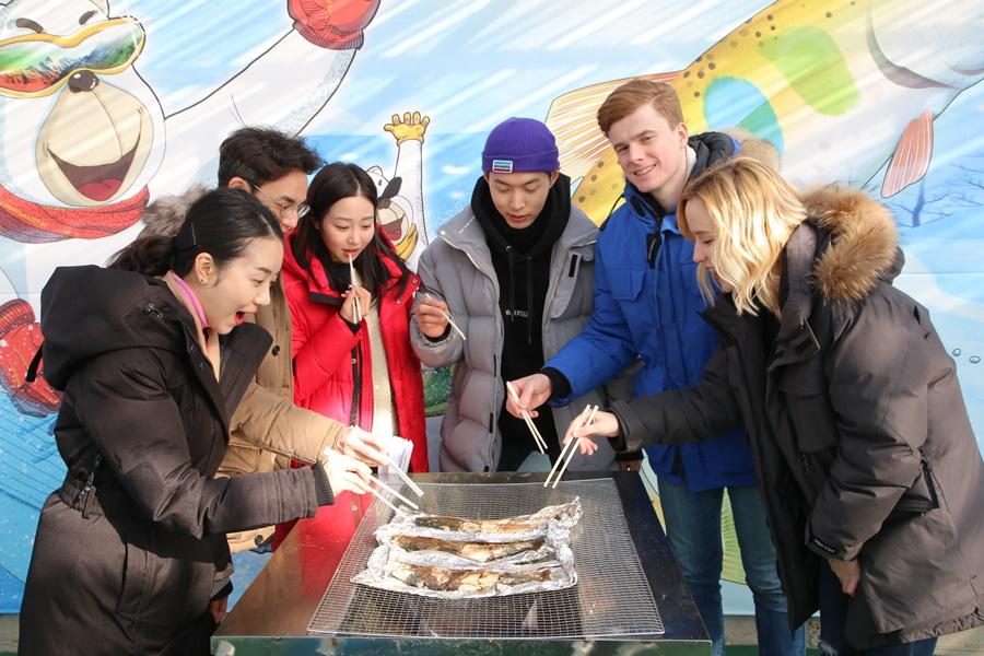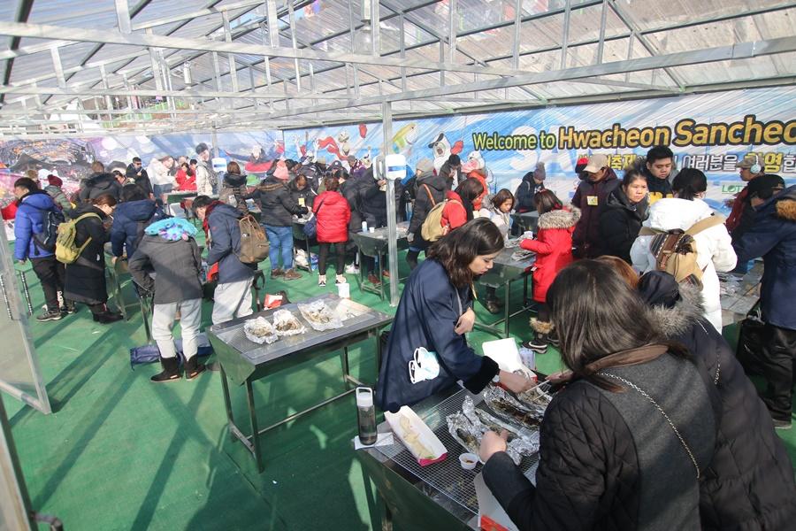 『山鱒魚體驗活動』:為了〔冰釣山鱒魚〕,在冬季的華川川上凍結40cm以上的厚冰層上拿著所有準備好的垂釣用品進入冰釣區,選定好冰釣窟窿釣竿等器具擺放好,掛上魚餌後就等山鱒魚上勾囉!而捕捉到的山鱒魚可在燒烤區或生食區品嚐它的鮮美嗞味。