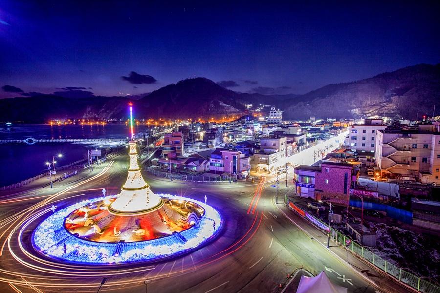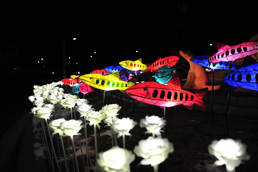 浪漫仙燈街可欣賞到五彩繽紛的LED燈打造出的浪漫氣氛。以在這兒也販售韓國傳統美食小吃:辣炒年糕、魚板湯等等,以及華川地區的農特產品,是可品嚐韓國特色美食與購買特產品的好機會!(圖片來源:華川郡提供)