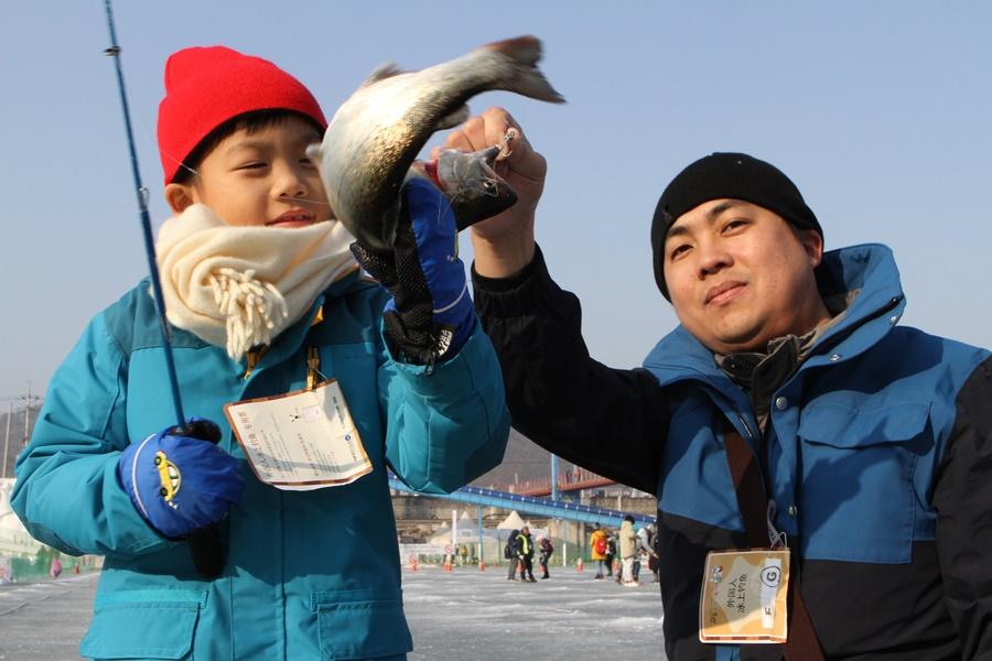 『山鱒魚體驗活動』:為了〔冰釣山鱒魚〕,在冬季的華川川上凍結40cm以上的厚冰層上拿著所有準備好的垂釣用品進入冰釣區,選定好冰釣窟窿釣竿等器具擺放好,掛上魚餌後就等山鱒魚上勾囉!而捕捉到的山鱒魚可在燒烤區或生食區品嚐它的鮮美嗞味。(圖片來源:華川郡提供)