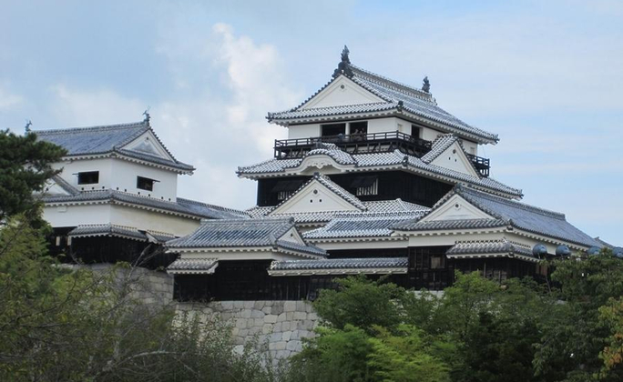 又名金龜城、勝山城,位在四國愛媛縣松山市市中心海拔132公尺的小山丘之上,與姬路城、和歌山城名列日本三大連立式平山城。是賤ヶ岳合戰當中有名的七本槍的其中一人加藤嘉明所建築的四國最大的城。巧妙的配置了門櫓、狹間、石落、石垣等裝置,是攻守機能優越的日本第一的連立式天守。平成18年被選定為日本百名城,並與道後溫泉一同選定為美麗日本的歷史的風土百選。