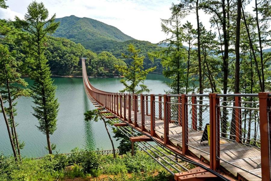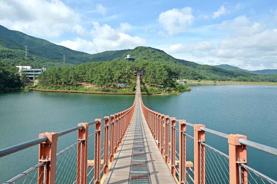 韓國最長吊橋就在坡州,2018年3月落成的馬場湖水吊橋全長220米,打破劉在錫曾打掃的原州小金山懸索吊橋200米的紀錄!站在橋上欣賞四季迥異的山湖風景~冬季結冰的湖面、春天灑下的櫻花雨、夏日綠意盎然的山巒、秋季滿山的紅葉等絕世美景,參觀人數已經突破200萬名
