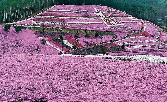 體型很小的芝櫻會將山麓染成一片粉紅色的花海,佈滿了整個丘陵地,猶如粉紅色地毯一般美麗,相當壯觀且迷人。