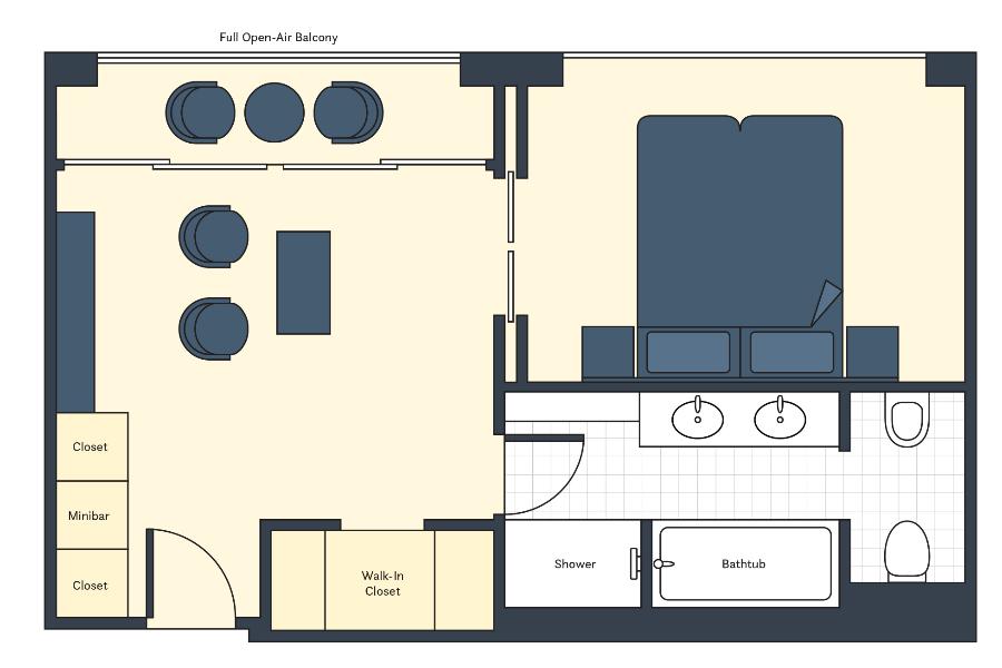 享受華麗且指定方位的河景視野之豪華套房擁有 大約 11.52 坪的室內空間,並擁有法式露台。房內採用來自英國手工設計的 Savoir® Beds 床俱組,內建衣櫥設備、吹風機、保險箱、個別獨立空調恆溫控制器,還有獨立起居空間,獨立的淋浴盥洗以及浴缸設備