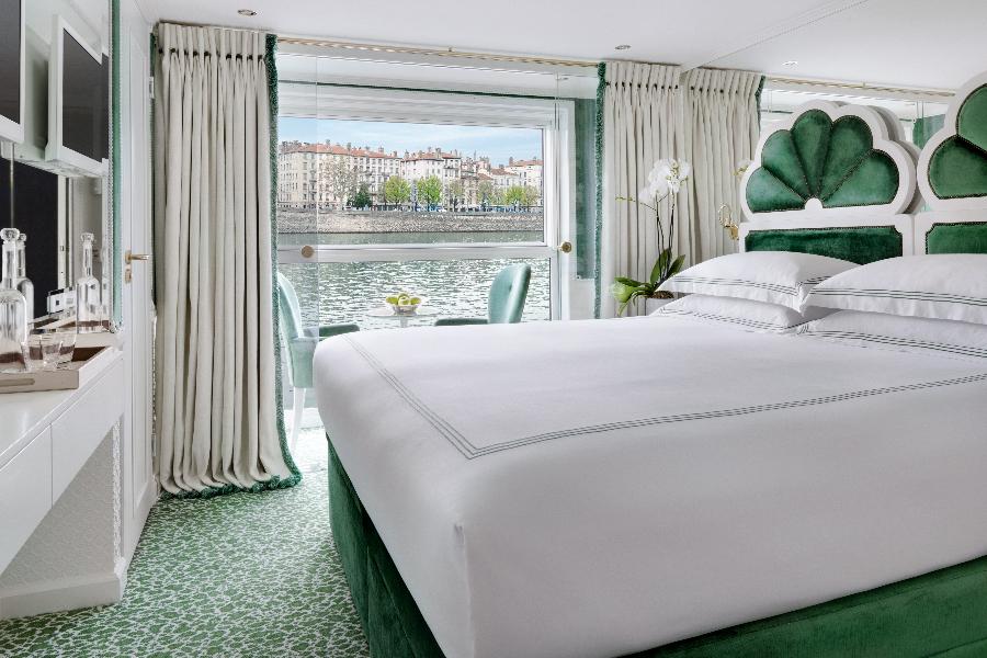 內裝帶有法式陽台的豪華河景客房,含有英格蘭手工製作Savoir名牌床、內置衣櫃、吹風機、保險箱、獨立空調