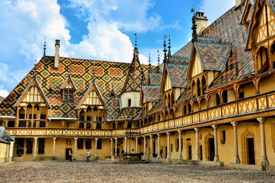 色彩斑斕的彩瓦屋頂,最初是為庇護貧困者與病患的慈善醫院,如今則以色彩斑斕的彩瓦屋頂成為小城最耀眼的符號,每年在此舉行的葡萄酒慈善拍賣,讓這座昔日的庇護所化身為世界矚目的酒鄉舞台