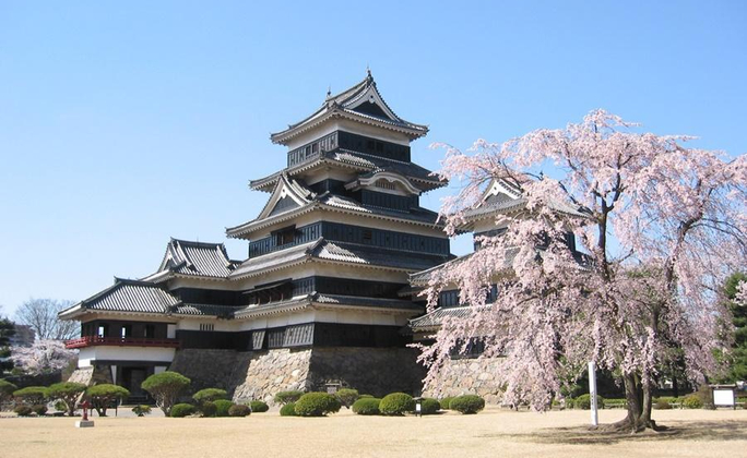 松本城別名「烏城」,為戰國時代建造的五層六階的天守閣,日本現存十二座天守之一與姬路城、犬山城、彥根城、松江城同為日本政府指定為國寶的古城。松本城曾在明治時代經過大規模的修改,城的四周已修建成了公園,園內四季風景優美,春天粉紅的櫻花,夏天綠意盎然,秋天火紅的紅葉,冬天雪白的雪景,天守閣黑與白的對比色與北阿爾卑斯山脈形成如畫般的美麗景觀。