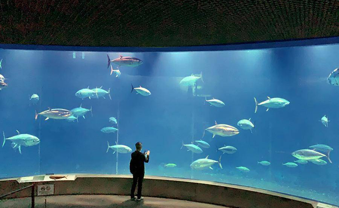 館內最特別的是直行28公尺,世界首創人工養殖鮪魚大水槽,在這個重約2200噸甜甜圈造型的金槍魚水槽裡,有機會看到成群的藍鰭金槍魚在遊弋!