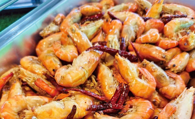 流水活蝦自己撈、生猛海鮮自己夾、各種熟食任君挑選,用餐區中間充滿著流水活蝦河道,服務人員會不斷補上活跳跳的鮮蝦,現烤現吃超享受。