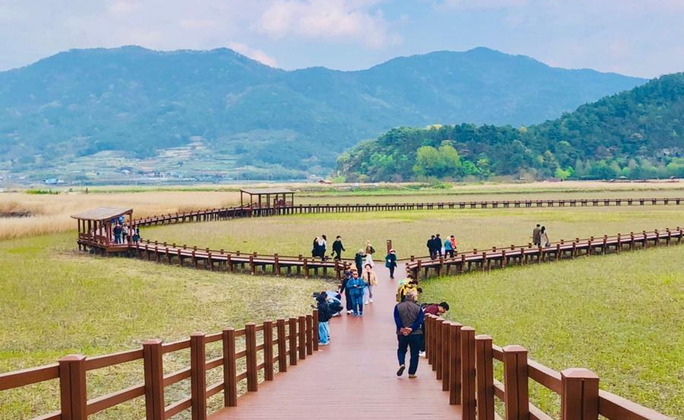 【順天灣濕地】沿著3公里河流形成潮間帶與蘆葦林,為全球五大沿岸濕地之一。蘆葦生態群落是白頭鶴等候鳥越冬與棲息的地方,潮間帶則是棲息著鰕鯱魚、火雞等各種生物的生態景點。從觀景臺上能眺望順天灣的S字形水路、蘆葦林上的日落,以及候鳥成群飛翔的壯觀景致。