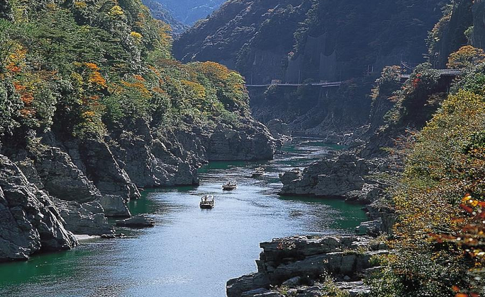 貫川四國山脈的吉野川,切割出令人讚嘆不已的小步危大步危峽谷自然奇景。從聳立陡峭的懸崖間乘坐觀光遊覽船,以另一個角度欣賞2公里長的奇岩怪石與千疊敷景勝相當壯麗。