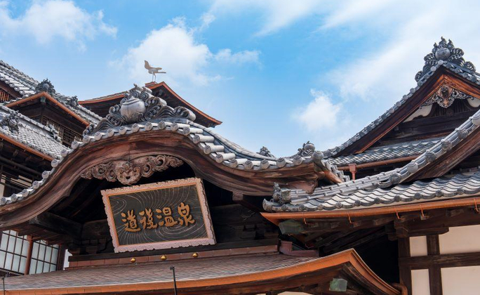 建造於1894年的公共溫泉浴場,為道後溫泉的代表、地標,據說是日本唯一擁有皇室專用浴室溫泉鄉的公共澡堂。幾年前深受大小朋友喜愛的宮崎駿動畫電影「神隱少女」裡當中的湯屋,靈感取材就來自道後溫泉本館的建築。雖然在這已看不到湯婆婆和千尋的身影但外觀造型之相似總讓人深入其境。