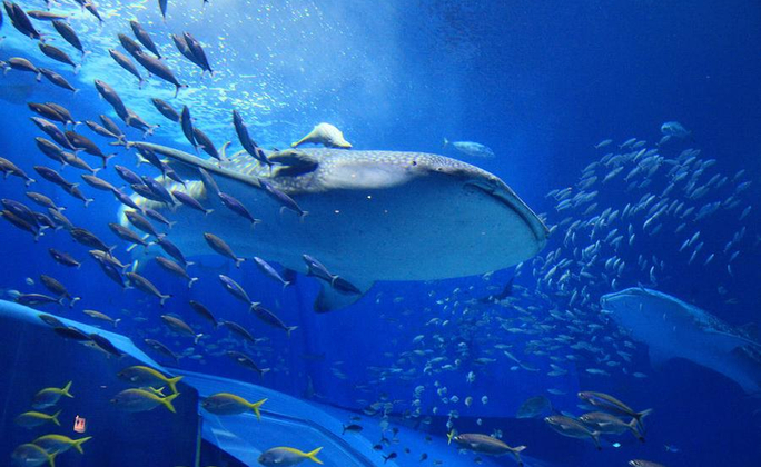 海洋博公園 (沖繩美之海水族館) 以『與琉球海洋有約』為主題,有3個主題水族箱:珊瑚礁之旅、黑潮之旅及深海之旅。可以讓你全覽沖繩沿海的水中生物,其中最棒的東亞第一大水族箱【黑潮之旅】。 在黑潮之旅中,可以看到細長不超過手掌的條紋蝦魚和毛煙管魚、可長大至14公尺長的7公尺鯨鯊、世界最大的軟骨魚--鬼蝠魟、有著黑人厚唇的曲紋唇魚,也可以看到像貌醜惡的石頭魚、章魚、蝦子等等350種奇形怪狀、大大小小的海中生物,令人嘖嘖稱奇,這種滋味就等你來試試囉!另有【海牛館】、【海龜館】可參觀,並欣賞可愛的【海豚劇場】,絕對讓您在此渡過難忘的歡樂時光!
