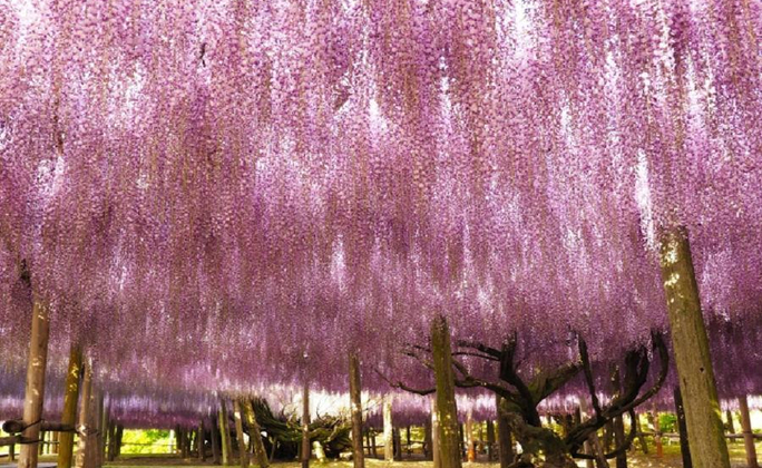 柳川中山大藤位於福岡縣柳川市,是日本指定的天然紀念物,擁有超過300年的歷史,樹冠覆蓋範圍約300坪(約1000平方米),是典型的藤棚式結構,枝條延伸如同紫色的花瀑布,壯麗程度令人嘆為觀止。