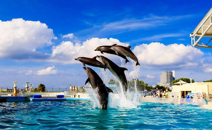 【海洋博公園(美之海水族館、海豚表演)】與琉球海洋有約”為主題,有3個主題水族箱:珊瑚礁之旅、黑潮之旅及深海之旅可以讓你全覽沖繩沿海的水中生物,其中最棒的東亞第一大水族箱─黑潮之旅。可以看到細長不超過手掌的條紋蝦魚和毛煙管魚、可長大至14公尺長的7公尺鯨鯊、世界最大的軟骨魚--鬼蝠魟、有著黑人厚唇的曲紋唇魚,也可以看到像貌醜惡的石頭魚、章魚、蝦子等等350種奇形怪狀、大大小小的海中生物,令人嘖嘖稱奇。另有【海牛館】、【海龜館】可參觀,並欣賞可愛的【海豚劇場】,絕對讓您在此渡過難忘的歡樂時光!