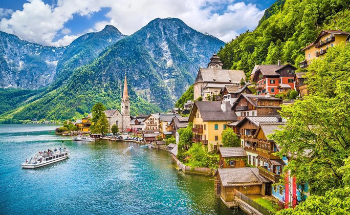 依山傍水的奧地利小鎮,如一條精美的絲帶遊走於翠林茂密的青山和碧綠清澈的湖畔之間,小鎮裡的木造建築精緻非凡,絕妙地融於畫作中一般的自然景色之中。