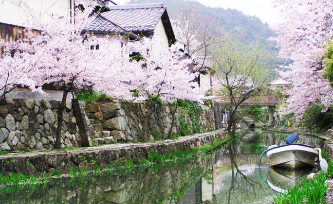 位於琵琶湖東南岸的近江八幡,是過往商業繁榮的水鄉都市。曾經商船密集往來的八幡堀如今雖不具備運河功能,兩側的白壁土藏、石疊小徑,充滿濃濃江戶時代風情,也是許多時代劇取景的地點。春天時滿布櫻花,更是吸引遊客前來。