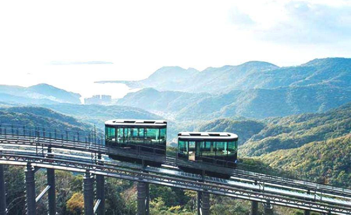 從稻佐山中腹停車場到山頂展望台需運行8分鐘左右。由設計義大利法拉利的世界級工業設計師設計的,從全景玻璃窗的時尚車廂中,可以欣賞到長崎日夜充滿活力的風景。