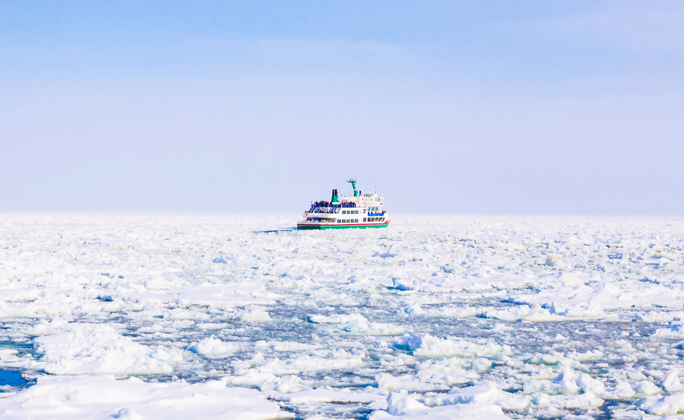 安排搭乘破冰船(約60分鐘),每年約1月中旬至3月下旬開航,此船兩邊有巨大的破冰鑽所以能破冰而行,可在廣闊冰洋之中感受到大自然造物的偉大力量,更能體驗征服流冰的神秘與喀吱作響的真實感,更深入了解鄂霍次克海的自然景觀,揭開流冰的神秘面紗。