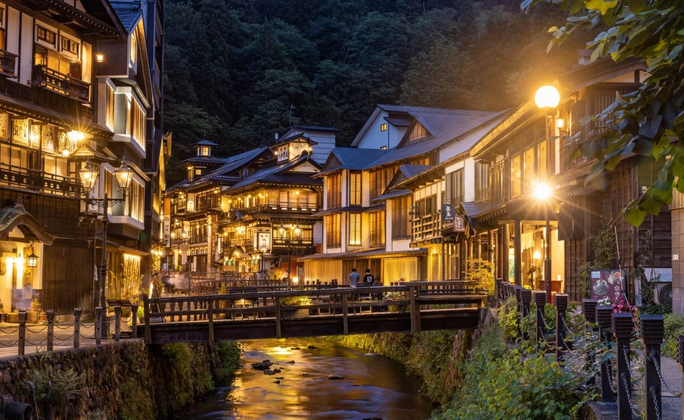 與宮城縣鄰接的山形縣尾花澤市內有一座沿著銀山川溪谷的銀山溫泉,銀山川清冽的河水冒著熱氣穿流其中,這裏有成排的3、4層樓木結構的旅館,氣氛寧靜,宛如世外桃源。多年前這裏發現了銀礦,所以這座溫泉村取名爲“銀山”,人們來到這裏總會産生一種錯覺,以爲到了拍攝日本古代戲的電影村。