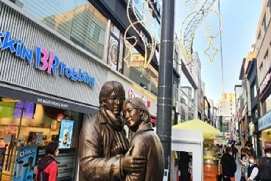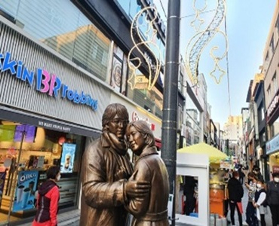 位於春川市中心,也是春川最繁華熱鬧地方,筆直的道路兩旁是一間間比鄰而居的各式商店,中間一整排的路燈還點綴當時冬季戀歌劇中出現的聖誕樹,散步於此,不僅能夠像劇中主角般優閒地享受逛街聊天的樂趣,更可以瀏覽與首爾同步的最新流行的資訊。【Starbucks THE春川衣岩湖店】