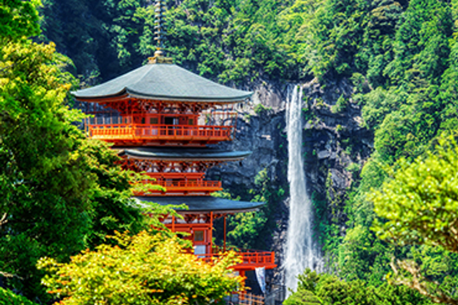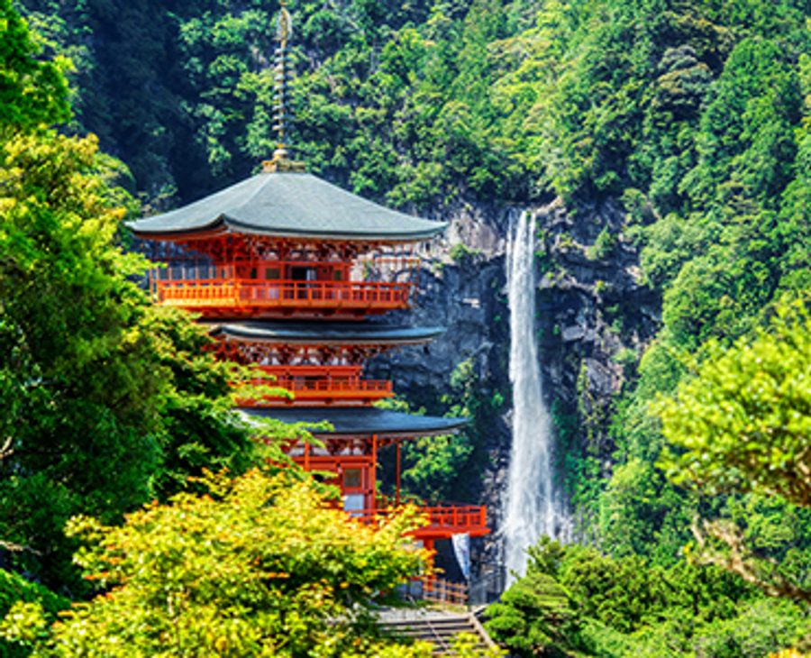 青岸渡寺,位於那智瀑布的前方。鮮紅的三重塔巧妙地將其建築與自然景致融合成奪目的美景。