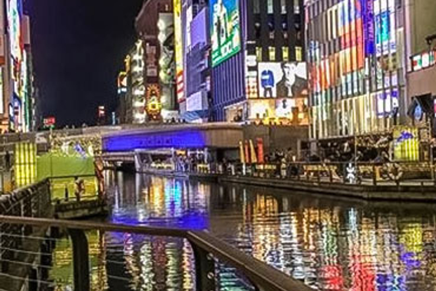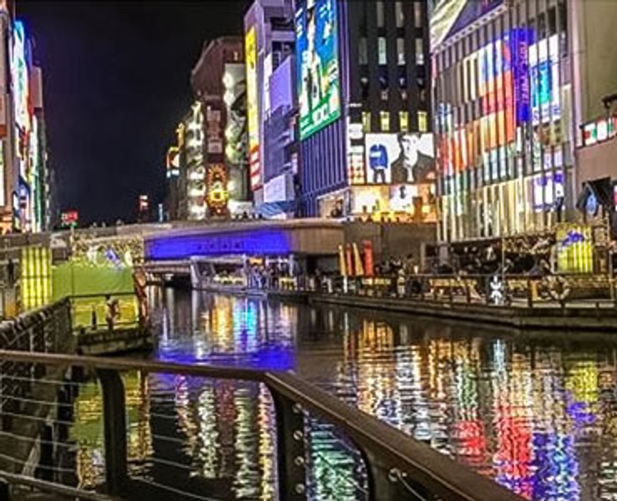 位於戎橋和道頓崛橋之間,霓虹燈光變化從紅、藍、橘到暗紅,代表道頓崛的一天。夜裡五光十色的霓虹燈倒映在河面,只見橋上拍夜景的人爭相尋找最佳的拍照角度。順道前往熱絡有名心齋橋商店街,在充滿了年輕氣息看不到盡頭的商店街,貼心的搭上透明雨遮蓬,無論刮風下雨都不減您逛街購物的興緻,大阪燒、章魚燒、一蘭拉麵、金龍拉麵、0101、H&M、ZARA、UNIQLO、高島屋、大丸百貨琳瑯滿目的商品,人潮不斷,完全感受大阪城市的鮮明氣息和閃亮的活力。而緊鄰隔壁綠樹成蔭的御堂筋大道則林立著多家世界性時尚名牌店。
