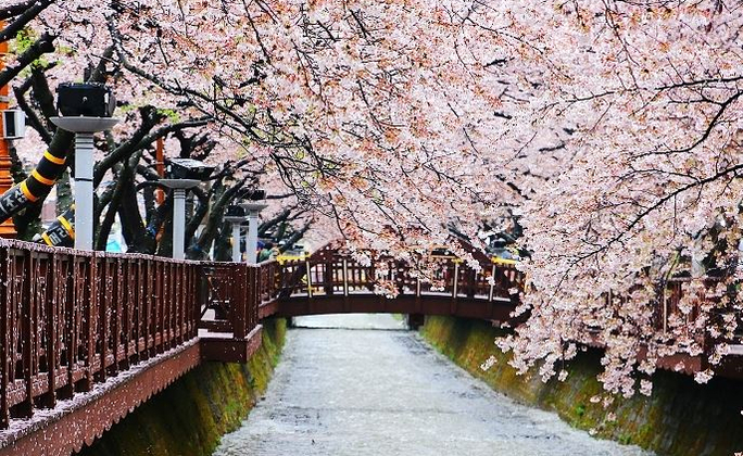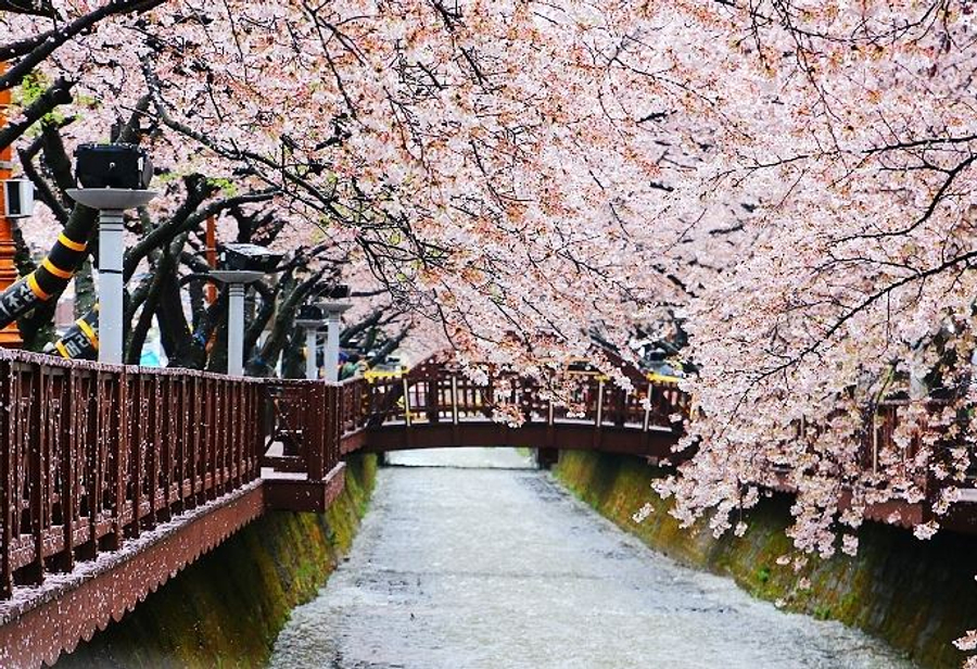 韓國最具代表性的賞櫻勝地,共種植8萬多棵櫻花樹。每逢櫻花盛開的3月底至4月初為此處櫻花盛開時節,粉白相間的櫻花樹花技招展,花瓣隨風飄落於身側,有如天女散花一般,給人置身仙境的幻覺。固定舉行為期10餘天的慶典盛會。每年軍港節舉行期間總是能吸引超越200萬名以上海內外遊客前來參加,由茂密的櫻花樹林形成的花之隧道,漫步在飄浮著迷人花香的清風中,並親身感受美麗的櫻花雨灑落在身上的愉悅。此外包括軍樂隊遊行表演活動在內,現場亦有準備各式各樣不同主題的活動等。