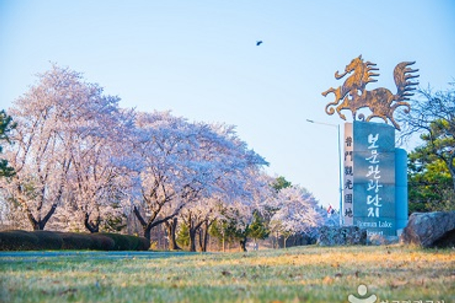 以慶州市區往東約6公里處的普門湖為中心,全境被指定為溫泉區及觀光特區。是一處綜合性的觀光療養地,入口處有一個巨大的水車,德洞湖水沿渠而下,使水車在自然動力下轉動。普門園內的溫泉池用噴涌著優質的溫泉水,平均溫度35.5度,不經加熱即可使用,旅客們可以此享受溫泉浴。沿著湖邊有長長的散步小道,道邊櫻花樹茂密,4月時櫻花綻開,園內成粉紅色的一片雪地。微風襲來時,粉紅色的花朵似乎是充滿了魔力,讓旅客們的臉上不由自主地浮現出微笑。【佛國寺】