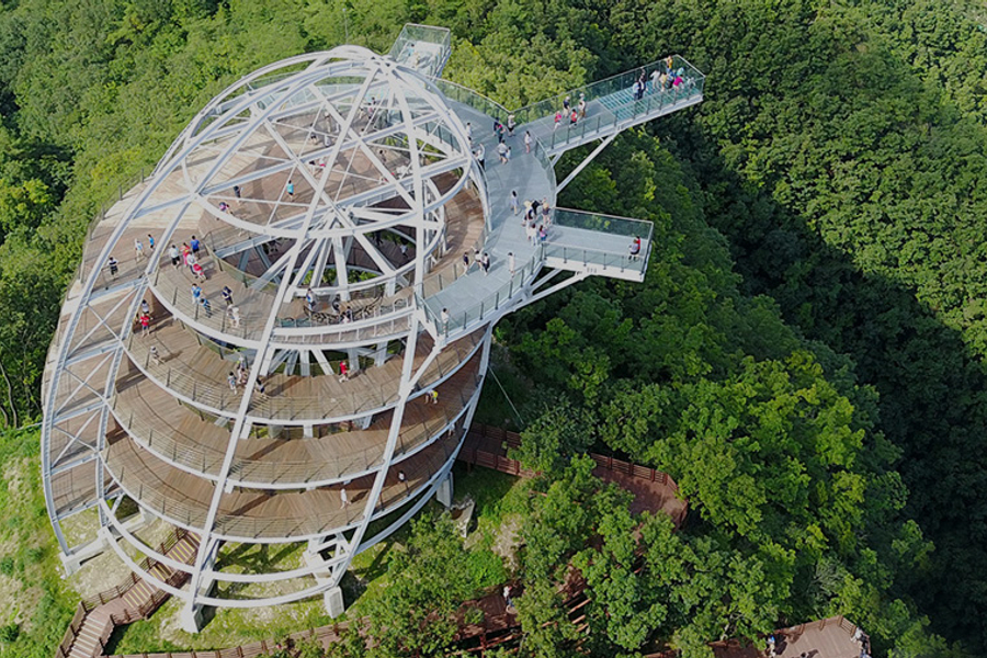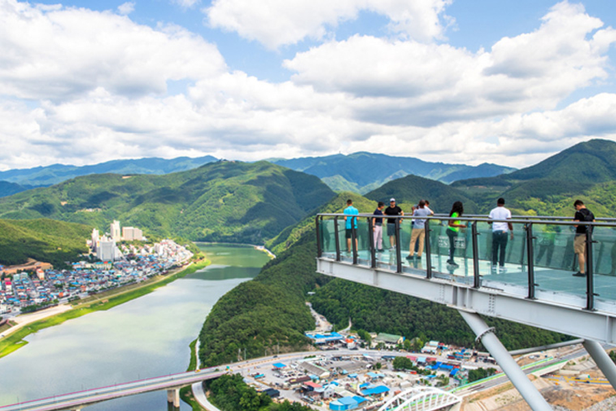 【滿天下空中走廊SKY WALK】擁有萬壑千峰眺望台、滑索和生態公園等設施。萬壑千峰所在的眺望台位於距離南漢江水面120米的高空,站在這裏能夠欣賞到小白山支流以及融匯到南漢江的美妙風景。眺望台外側突出的部分是按照三足鳥進行設計的,這條天空之路使用三層高強度透明鋼化玻璃製成,站在這裏能夠感受到到驚險刺激。漫步在長600余米的螺旋形散步陸上,能夠360度欣賞到小白山、嶽月山等白頭大幹的著名山脈。