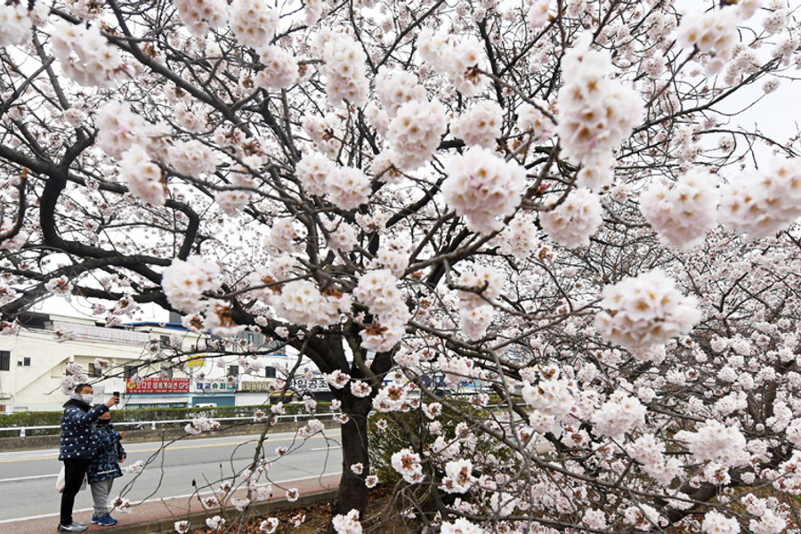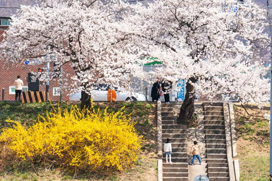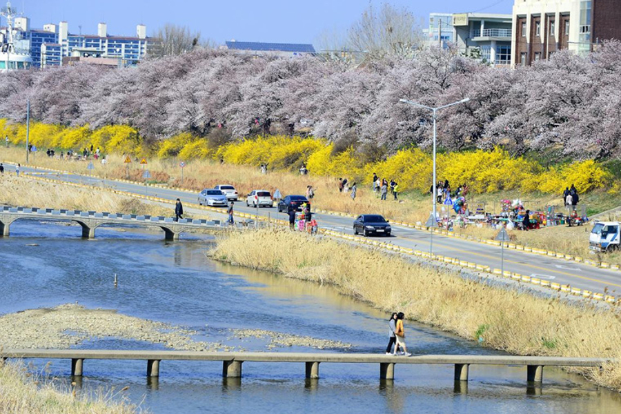 【無心川櫻花】無心川貫穿整個清州市中心,將清州分成上黨區和興德區,河流全長約33.5公里,是錦江的支流。三月底到五月的春季,在美麗的無心川河旁邊道路及休閒散步道路--無心川櫻花路被櫻花綻放成白茫茫的一片,一旁還有粉黃色的迎春花,吸引許多情侶和遊客前往。