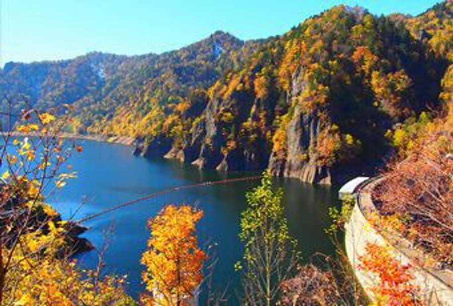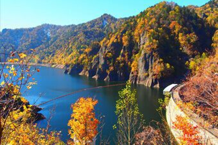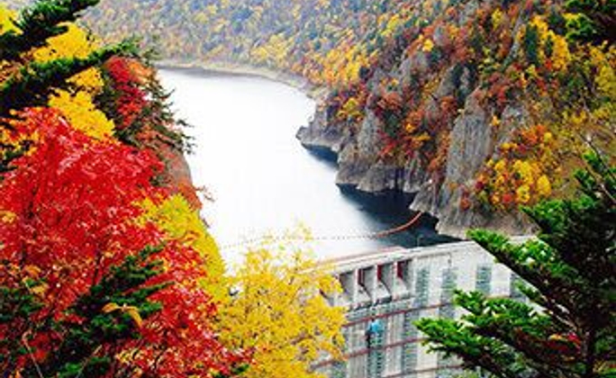 【豐平峽溪谷】從定山溪溫泉沿著豐平川溯流而上約7km的拱形水壩。原生林和柱狀節理的溪谷環繞,是著名的賞楓景點,在水壩上的人行步道可近距離眺望湖面,水庫和紅葉的對比得以欣賞秋天美麗的溪谷紅葉景色。