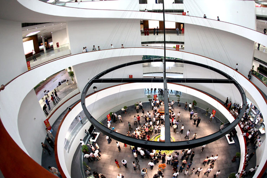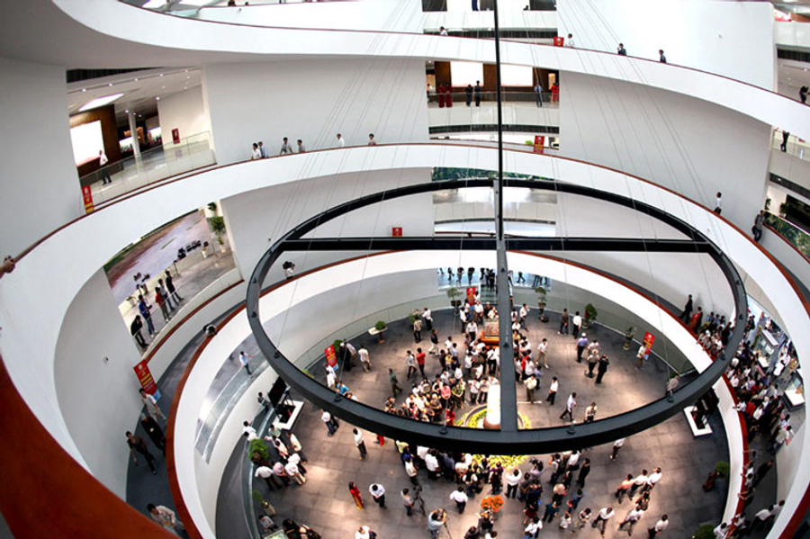 【河內博物館】由於展覽空間全部安排在建築的首層至三層, 會議、科研中心,辦公空間以及圖書館則集中 佈置於四層之上。此外這裡的上空展覽空間和 圓形中庭異曲同工,可陳列規模宏大的特殊展 品,漫射的光線透過風車槳葉式分佈的天窗進 入室內,將人們帶入展覽的氛圍之中。 建築體如同一座倒置的金字塔。建築各層樓板 均以8.4米x8.4米的網格為基礎,通過拉力桿件 懸掛於屋頂結構上,屋面結構(邊長109,2米x 109.2米,高5米)則直接架設於核心筒之上。 屋架由鋼筋混凝土牆板和桁架組成。牆板連接 了四個核心筒,加強了建築整體的穩定性。 為了減輕了其自身重量,屋架的邊緣及其內部 為鋼桁架結構。