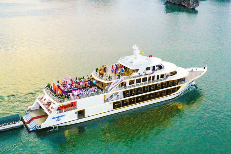在碼頭登上下龍灣亞特圖斯號遊船SeaOctopusCruise:下龍灣遊船設計具現代風格,使用中央空調系統,擁有數層公共活動區域,室內餐廳及寬廣視野的甲板,最大可容納約280人。