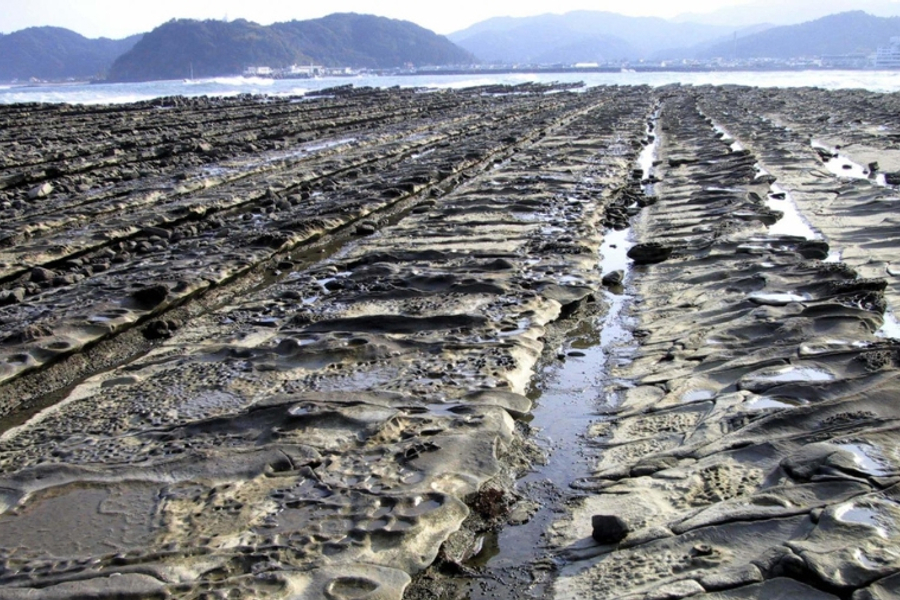 ※備註:如遇日南太陽花園定休無法前往時,將退回團體料金成人¥900元、國高中生¥600元、兒童¥400元。【鬼之洗衣板(車上觀光)】被日本國家指定的天然紀念物,青島綿延至巾著島約8公里的海岸,當退潮時,即會出現一片波浪的奇岩。這一片波狀奇岩連綿不絕的神秘景觀是青島周邊最著名的景點,這一處奇景是由約3000~1500萬年前海底累積的砂岩及泥岩地層隆起,再持續受到海浪的侵襲而形成的。