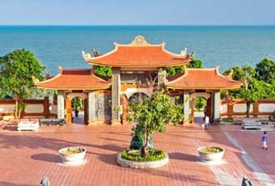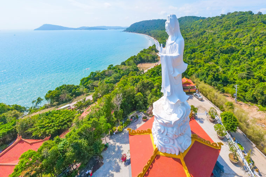【護國寺】越南主要宗教信仰為佛教。護國寺位於富國島的東南方,是島上最具代表性的宗教和文化遺址之一,依山傍水,風水極佳,每一位到富國島的旅客都會到此來誠心禮佛,欣賞護國寺居高臨下的海岸美景。護國寺內供奉著多尊佛像,其中最引人注目的是一尊高達 18 公尺的白色大佛,矗立在寺廟中心,不僅是信徒膜拜的中心,也是遊客拍照留念的熱門景點。
