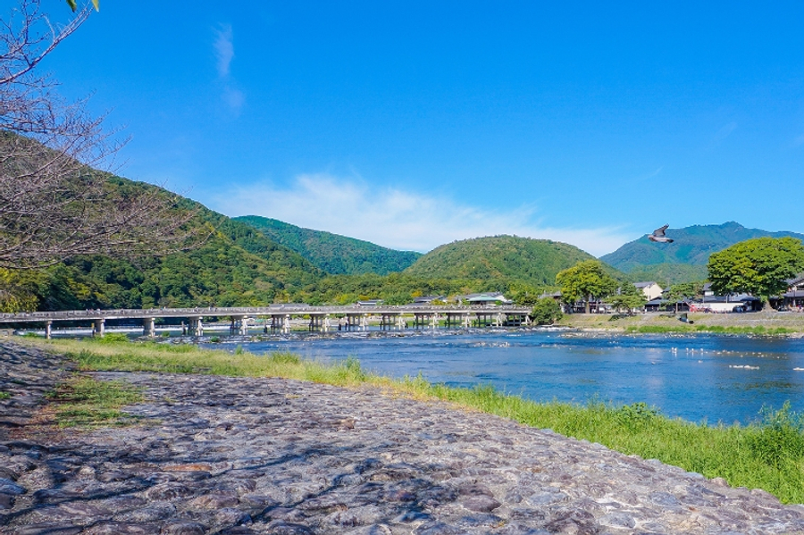 【京都嵐山渡月橋】渡月橋乃昔日山天皇因皓月橫空啟發而命名,如今是電影時代劇的熱門景地,橫跨大堰川的渡月橋,自古即有許多詩歌為之傳頌,此地的秋色與冬景常是騷人墨客最好的題材,有著濃郁之傳說色彩,漫步悠遊,令人心曠神怡,站在渡月橋上觀賞滿山白色的山櫻景致,好似覆雪的山。續往嵯峨野竹林步道欣賞竹林之美,沿路二旁的竹木高聳,靜幽詩情,閑靜中盡是畫意。