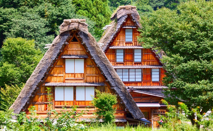 白川鄉合掌村約有200~300年前所留的合掌式造作建築,地處豪雪地帶、再加上山區地形阻絕、形成地域獨特的 風俗文化,至今仍完整保留為日常生活之用,其中以合掌型的茅草家屋最為著名,為防積雪而建構的急斜面的茅 草屋頂,有如兩手合掌的形狀,目前尚有113棟,屋旁田地園圃交錯銜接,構成一幅濃厚懷古幽情、山間農村的田 園景觀,於1995年12月聯合國文教組織登錄為世界遺產以來,世界各國的觀光客蜂擁而至,在此地可了解文化歷 史背景的來源。沿著小步道前往山坡上的荻町城跡展望台俯瞰整個村落,更是有數大便是美的壯觀。