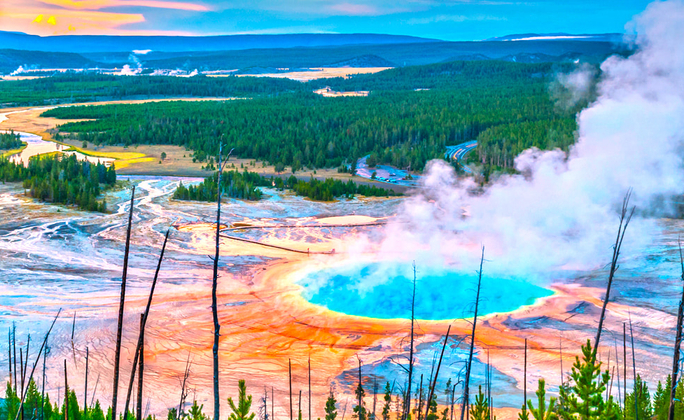 Yellowstone Westgate或Clubhouse Inn或Kelly Inn或同級 第 4 天 黃石國家公園 >大稜鏡溫泉 >彩色鍋噴泉 >老忠實噴泉 >西姆指噴泉盆地 >黃石湖 大稜鏡溫泉 位於美國黃石公園的七彩池,又稱大稜鏡溫泉(Grand Prismatic Spring),從裡向外分別呈現出藍、綠、黃、橙、橘等不同顏色,被譽為「最美的地球表面」。其最突出的特點就是它的顏色變化:由綠色到鮮紅再到橙色。溫泉水中富含礦物質,使得水藻和菌落中帶顏色的細菌在水邊得以生存,從而呈現了這些色彩。當你漫步於公園內步道時,神奇熱泉蒸騰出的霧氣徘徊在你的周邊,繽紛的色彩錯落的分布在廣袤的大地之上,總會有一種置身仙境的感覺。 彩色鍋噴泉 下間歇噴泉盆地最與眾不同的看點是泥沸泉,就是說泉眼冒出來的不是清水,而是泥漿,而且是非常黏稠的泥漿。在眾多泥沸泉中,最有代表性的就是彩色鍋噴泉(Fountain Paint Pots),一個不斷噴出高溫彩色泥漿的熱泥泉,如泥沼般的泉水,受地熱沸騰而冒著滾燙的泥泡。 老忠實噴泉 黃石公園的間歇泉,在世界上可稱是屬一屬二,雖然在世界各地也有很多的間歇泉,但是其總數加起來,卻沒有一個黃石公園來的多。分布在黃石公園內的間歇泉就約有三百多個,而它的熱噴泉也是全世界最規律的。首先登場的是位於黃石公園西南區的老忠實噴泉(Old Faithful Geyser),自1870年被發現後,它每隔79分鐘就會噴一次,一噴就是45至55公尺,由於它的守時,贏得「老忠實」的封號。 西姆指噴泉盆地 黃石湖西部突出的湖面像是拇指,被稱為「西姆指(West Thumb)」,這裡約在十五萬年前因地殼陷落而形成西姆指噴泉盆地(West Thumb Geyser Basin),四週分布很多噴泉這裡環繞噴泉周圍舖設了木板的步道,步道的兩側有許多泉池,靠湖邊的步道,還可以欣賞美麗湖景,由於熱泉的蒸氣與湖水相結合,形成一片煙霧瀰漫的特殊景觀。 黃石湖 在距今約64萬年前,黃石公園所在的這個區域,發生了驚天動地的火山爆發,在黃石公園的中心形成數百公尺深的巨大火山口,之後逐漸被冰雪形成的冰河,積壓推擠,改變了火山的地貌,而今日碩大的黃石湖,就是當年巨大火山口殘存的痕跡,是典型的火口湖,也是美國最大的高山湖泊。
