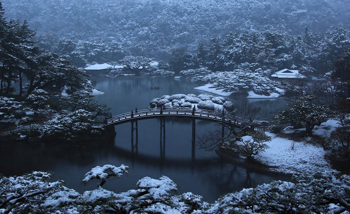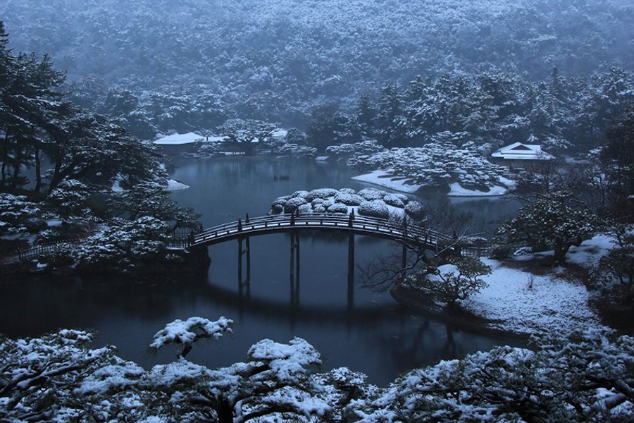 【岡山後樂園】興建於約300年前,是日本具代表性的諸侯庭園,和金澤市的兼六園、水戶市的偕樂園並稱日本三大名園,總面積約13公頃,整個庭園的設計採借景法之池泉迴遊式庭園,以操山、岡山城做為背景,唯心山及澤池為中心所建的一座林泉迴遊式庭園。座落於園內中心的流店,特意將流水通過建築物下方,可於此欣賞水流的變化,成為歷代藩主靜心思考的絕佳場所。