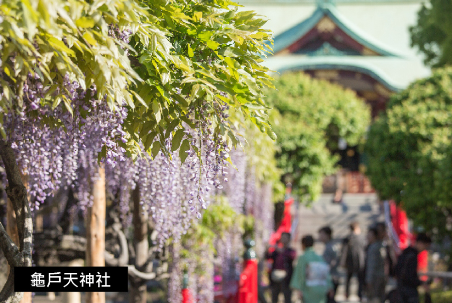 【龜戶天神社】供奉學問之神的龜戶天神社,吸引着各種年齡層的學生到訪,希望能藉由神助,協助他們通過考試。由於龜戶天神社會在晚冬時節盛開粉色梅花,春天綻放紫色的紫藤花,被選為「名所江戶百景」之一。